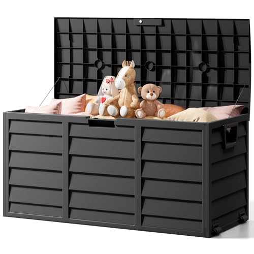 The Fellie Garden Storage Box with Wheels, 290L Lockable Garden Storage Boxes Waterproof, Plastic Outside Storage Box for Gardening Tools, Cushions, Toys, 112x49x54cm, Black