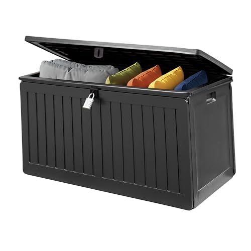 The Fellie Garden Storage Box with Wheels, 290L Lockable Garden Storage Boxes Waterproof, Plastic Outside Storage Box for Gardening Tools, Cushions, Toys, 112x49x54cm, Dark Grey