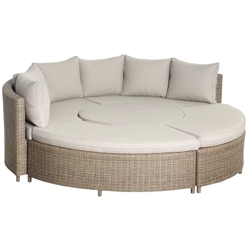 Outsunny 5 Pieces Outdoor PE Rattan Round Garden Daybed with Cushions, Aluminium Patio Furniture Set Lounge Chair Conversation Sofa Set with Liftable Coffee Table and Protect Cover, Grey