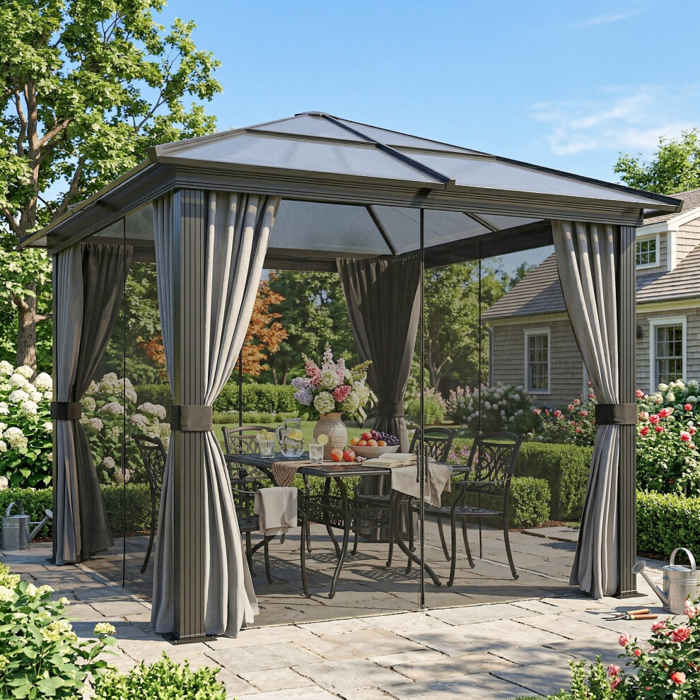 Outsunny 3x3(m) Aluminium Hardtop Gazebo Canopy w/ Polycarbonate Top, Curtains