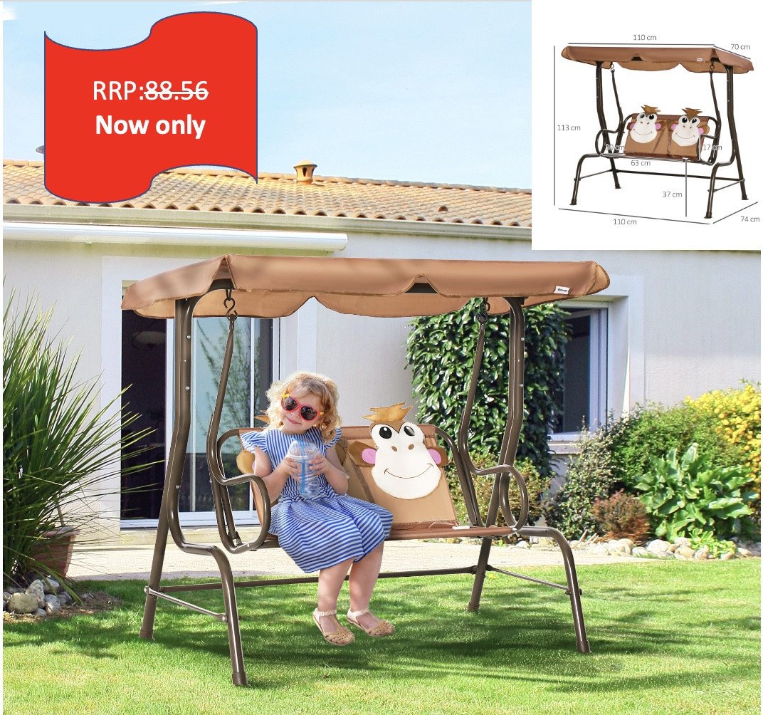 2 Seat Kids Canopy Swing Adjustable Awning, Seat Belt, Monkey Pattern