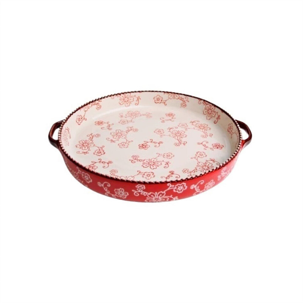 Ceramic Pizza Baking Dish Round Pan with Double Handles for Oven Cheese Baked Rice Casserole Tray Red