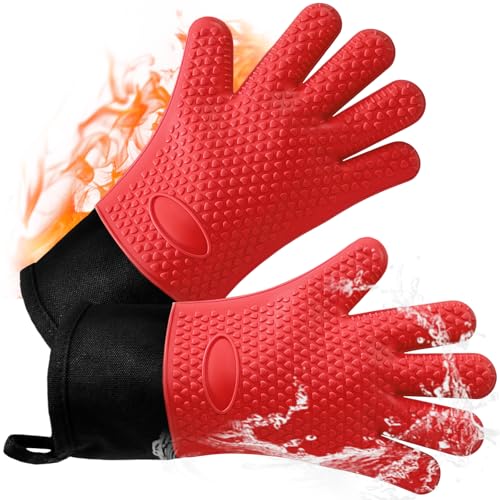 AMFUN 1 Pair Silicone Oven Gloves Heat Resistant 464°F, Extra Long Non-Slip Oven Mitts,Silicone BBQ Gloves with Fingers, Waterproof Kitchen Gloves for Barbecue Grilling Weber Pizza Microwave-Red