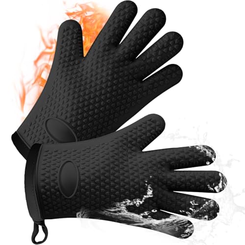 AMFUN 1 Pair Silicone Oven Gloves Heat Resistant 464°F, Non-Slip Oven Mitts,Silicone BBQ Gloves with Fingers, Waterproof Kitchen Gloves for Barbecue Grilling Weber Pizza Microwave-Black