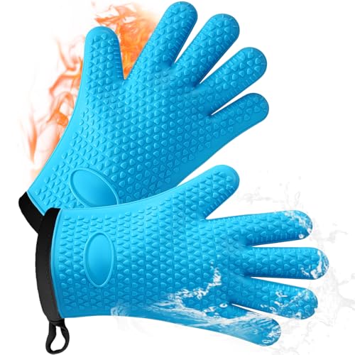 AMFUN 1 Pair Silicone Oven Gloves Heat Resistant 464°F, Non-Slip Oven Mitts,Silicone BBQ Gloves with Fingers, Waterproof Kitchen Gloves for Barbecue Grilling Weber Pizza Microwave-Blue