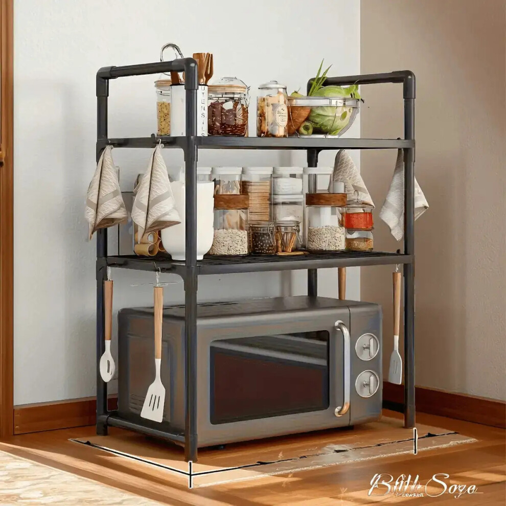 (Black, 905 on the second floor) Y905 Heavy-Duty Expandable Microwave Oven Shelf with 6 Hooks, Easy Assembly, Kitchen Storage Solution| Modern Kitchen