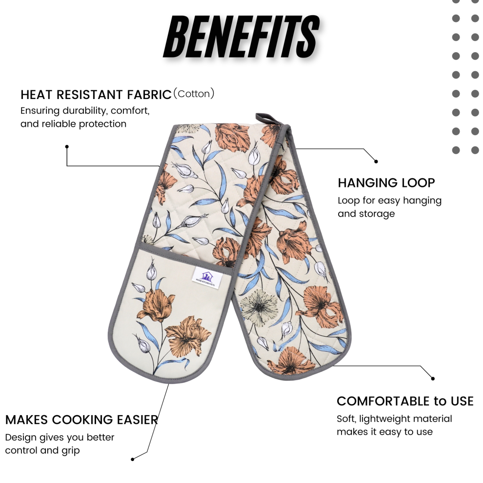 (Floral Grey) Double Oven Gloves UK | Heat-Resistant Mitts & Heavy-Duty Pot Holders for Kitchen, Farmers, and Cooking