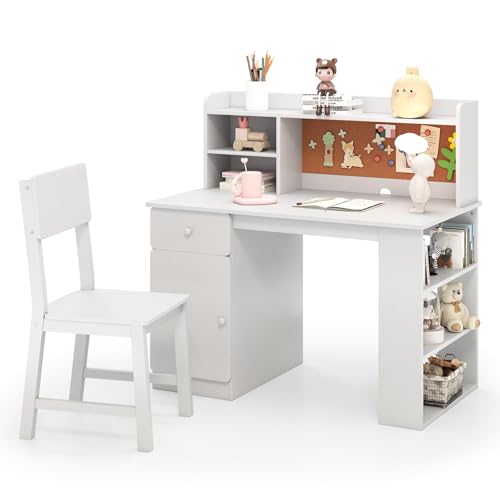 Kids Desk and Chair Set, Study Table for Children with Cork Board, 3=Tier Shelf, Cabinet, Drawer and Cable Hole, Desk and Chair Set Writing Reading Desk fir Boys Girls Over 7 Years Old (White)