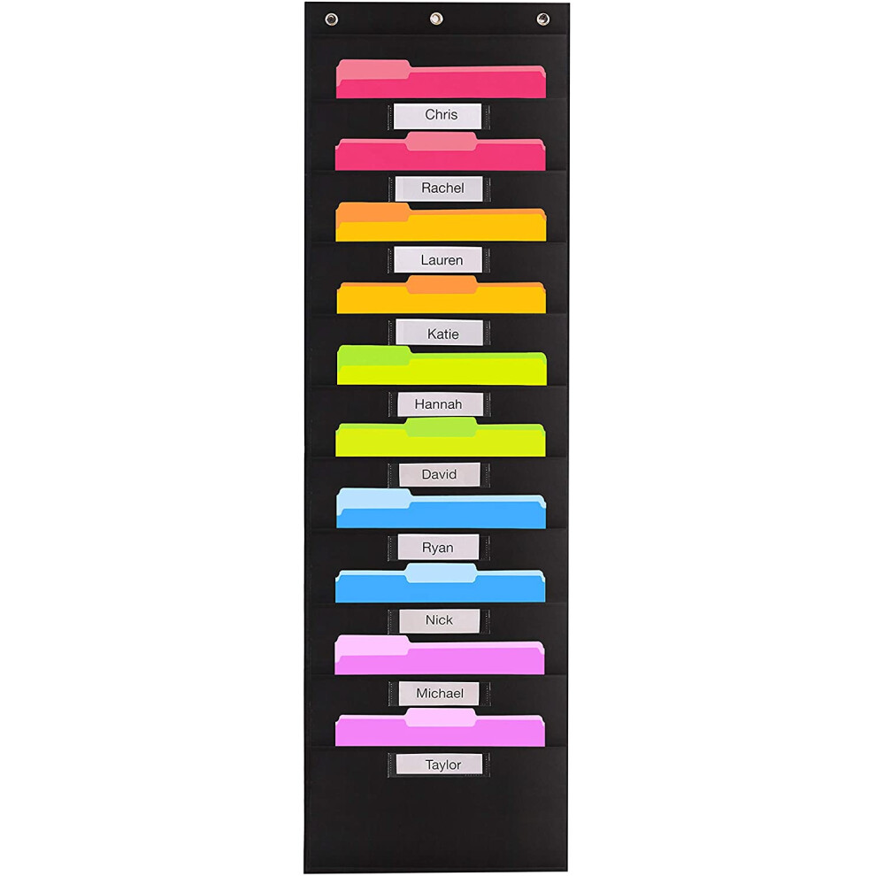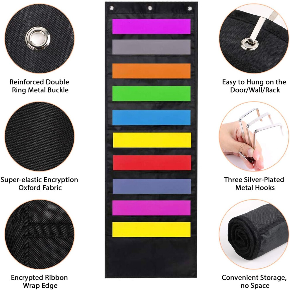 Black Pocket Chart for Classroom - 10 Pocket Storage Rainbow Pocket Charts 3 Over Door Hangers Included Hanging Wall File Organizer for F