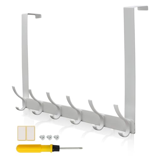 ZOCONE Over Door Hook White with Double-Ended Screwdriver, Heavy Duty Over The Door Hanger with 6 Hooks Space Saving Over Door Coat Rack, 28x39.5cm Over Door Hangers for Clothes, Towel, Keys and Bag