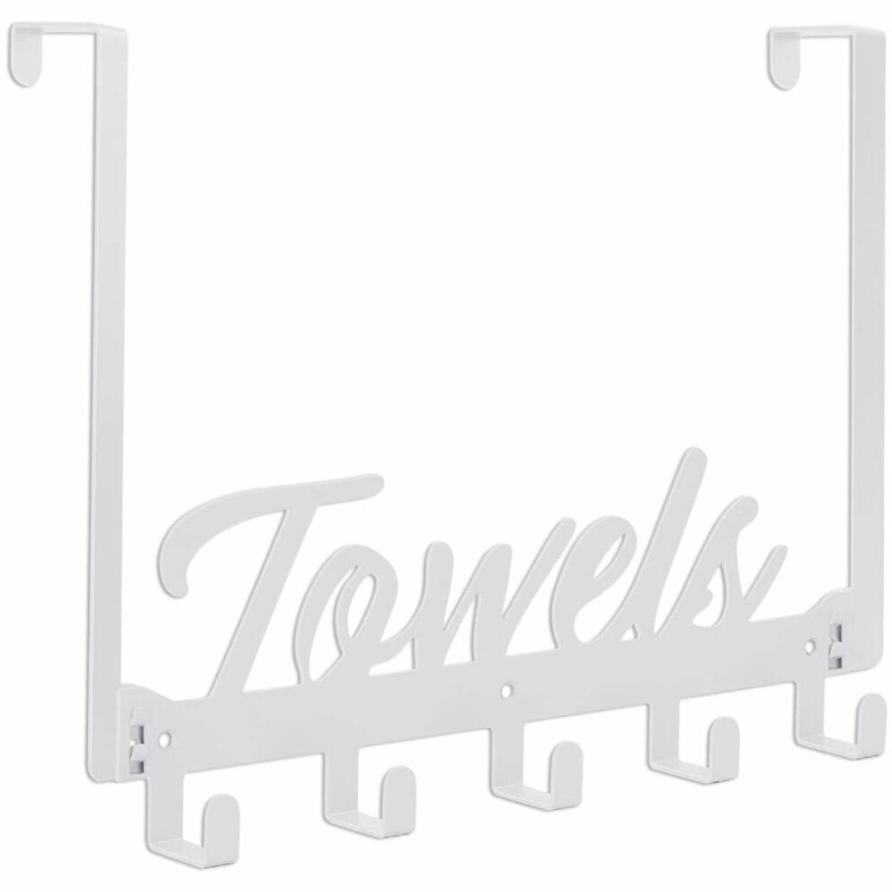 Azmoncy 1 Pack Over The Door Hooks, Towel Rack for Bathroom Towel Holder for Hanging Heavy Duty, Wall Mount Towel Hanger with 5 Hooks for Bedroom Bathroom Kitchen Towels, White