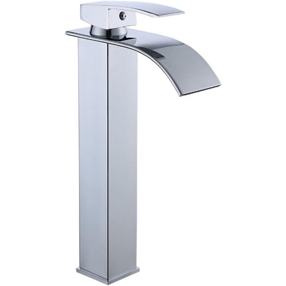 Waterfall Overmount Basin Faucet Hot And Cold Tall Flat Spout Single Lever Silver Finish Bathroom Sink