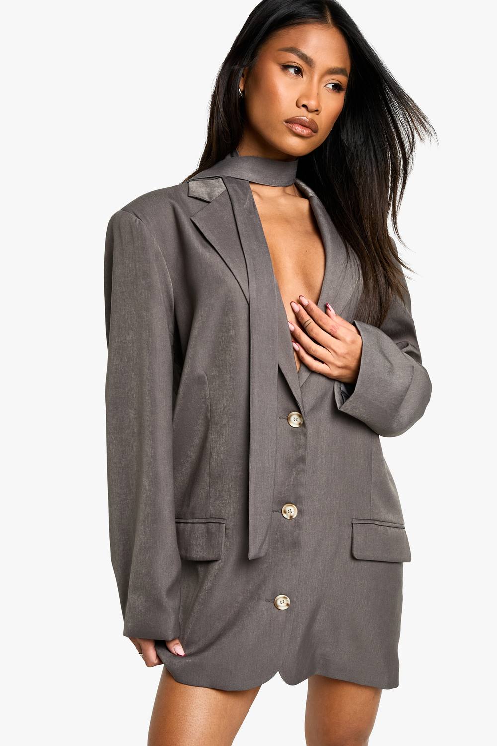 Womens Tailored Oversized Boxy Fit Scarf Detail Blazer Dress - Grey - 8, Grey