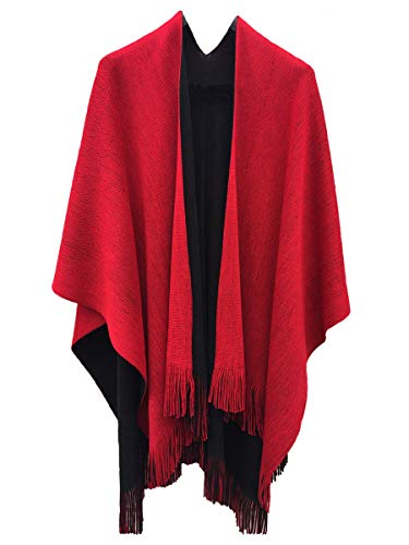 Womens Reversible Knitted Poncho Cape Oversized Christmas Scarf Blanket Shawl Wrap (Red)(Size:L)