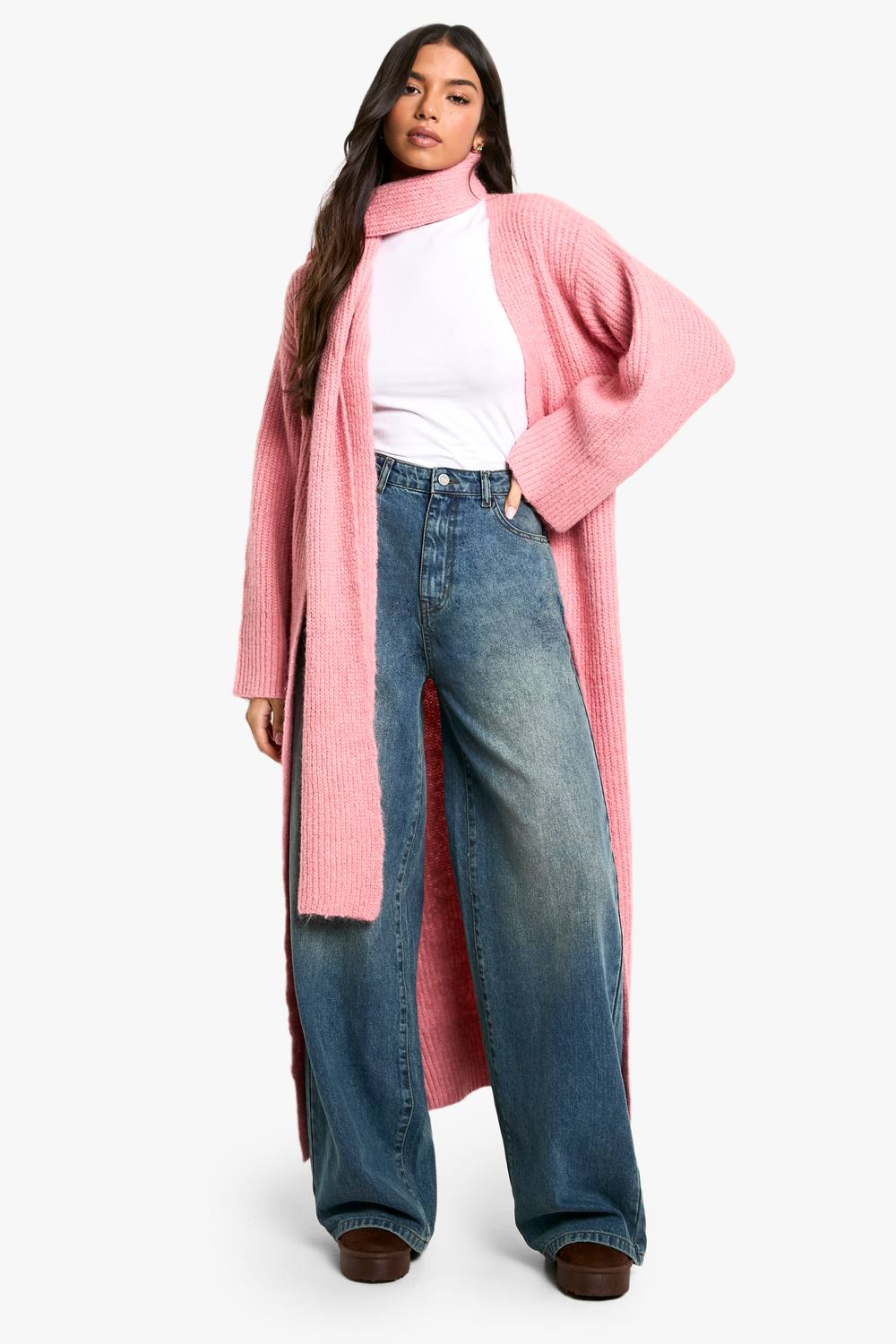 Womens Knitted Maxi Cardigan And Oversized Scarf Set - Pink - Xs, Pink