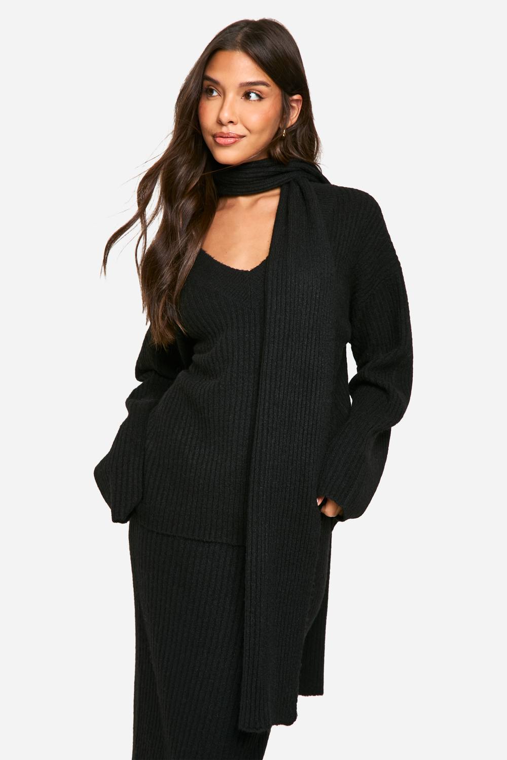 Womens Soft Knit V Neck Oversized Jumper And Scarf - Black - S, Black