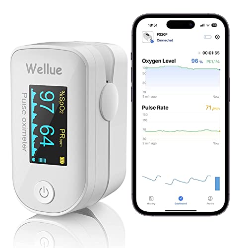 Wellue Pulse Oximeter Fingeroximeter with Bluetooth,Oxygen Monitor Finger Adults with App,Monitor Blood Oxygen Saturation and Heart Rate, with Alarm & Battery
