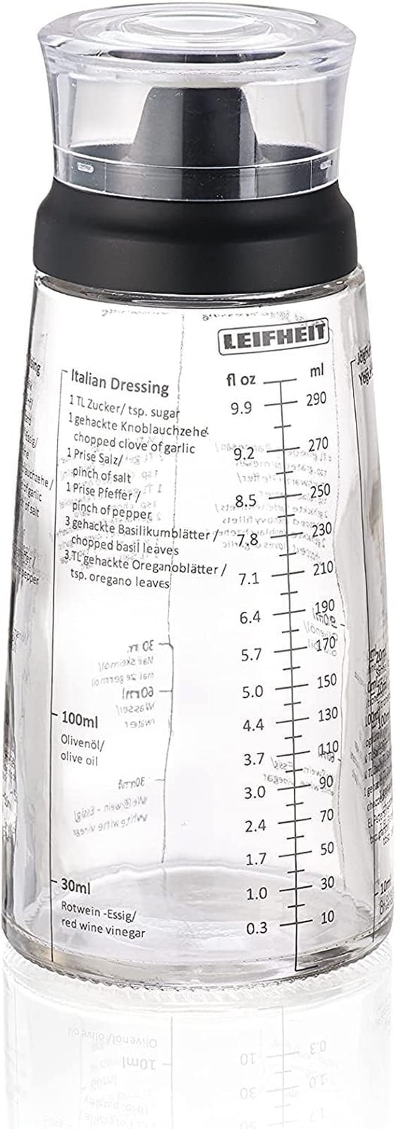 Leifheit Salad Dressing Shaker, 5 Imprinted Recipes, Glass Bottle, Non-Drip Spo