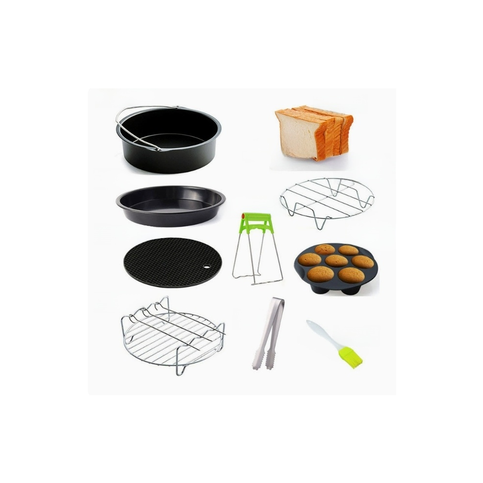 Air Fryer Accessories, 10-piece Set for Nonstick Cake Barrel, Pizza Pan, Cupcake Pan, Metal Holder, Skewer Rack, Silicone Mat, Food Tong, Oil Brush, P