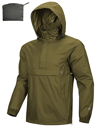 Outdoor Ventures Rain Jacket for Men Waterproof Pullover Lightweight Hooded Outdoor Raincoat Packaway Breathable Reflective Anorak Jacket for Travelling, Camping, Running, Hiking, Army Green M