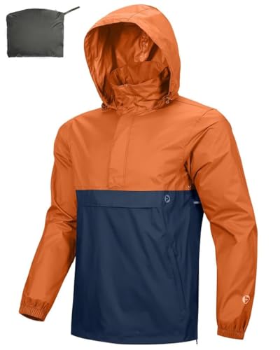 Outdoor Ventures Rain Jacket for Men Waterproof Pullover Lightweight Hooded Windbreaker Outdoor Raincoat Packaway Breathable Windproof Shell Jacket for Camping, Hiking Deep Orange/Dark Blue S