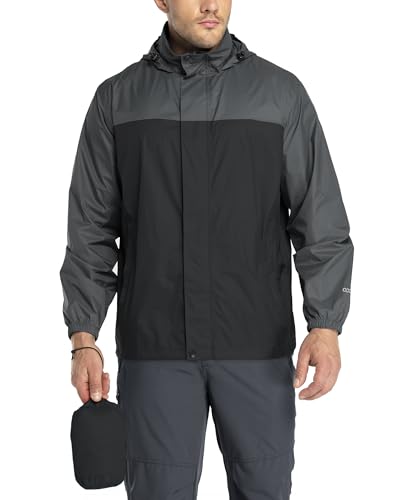 33,000ft Men's Lightweight Waterproof Outdoor Jackets Windproof Rain Shell Jacket Packaway Hooded Raincoat for Golf Fishing Cycling Black/Grey L