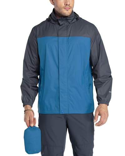 33,000ft Men's Lightweight Waterproof Outdoor Jackets Windproof Rain Shell Jacket Packaway Hooded Raincoat for Golf Fishing Cycling Classic Blue/Grey L