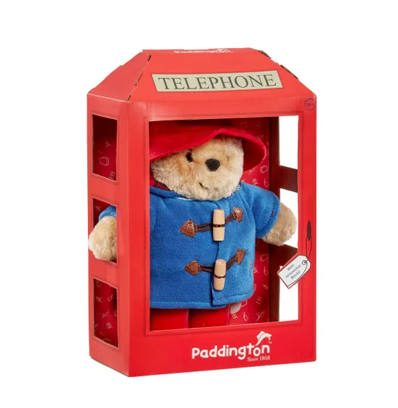 Paddington Bear Soft Toy in British Phone Box - Plush Teddy with Red Hat, Blue Duffle Coat & Wellington Boots - Collectable Stuffed Animal in Iconic