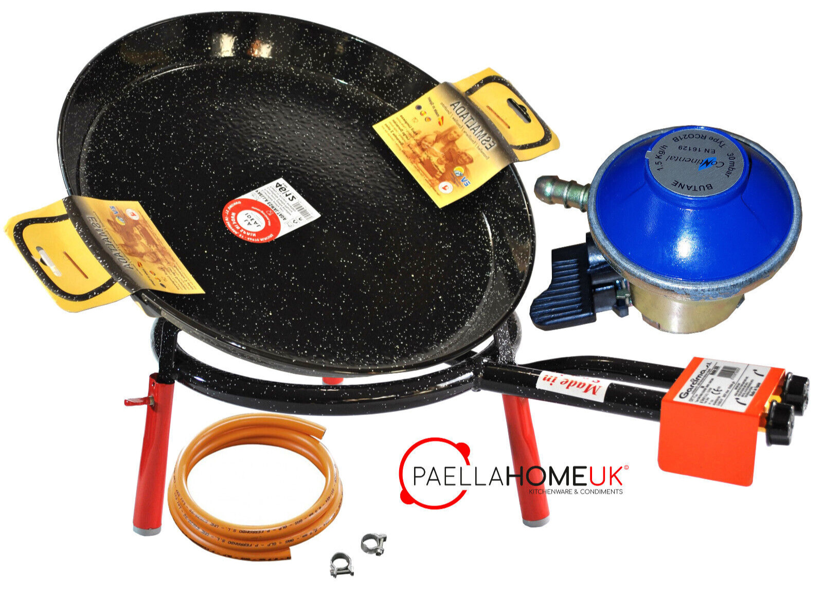 46cm Enamelled Paella Pan + 30cm 2 Ring Gas Burner + Butane Regulator + Legs Set