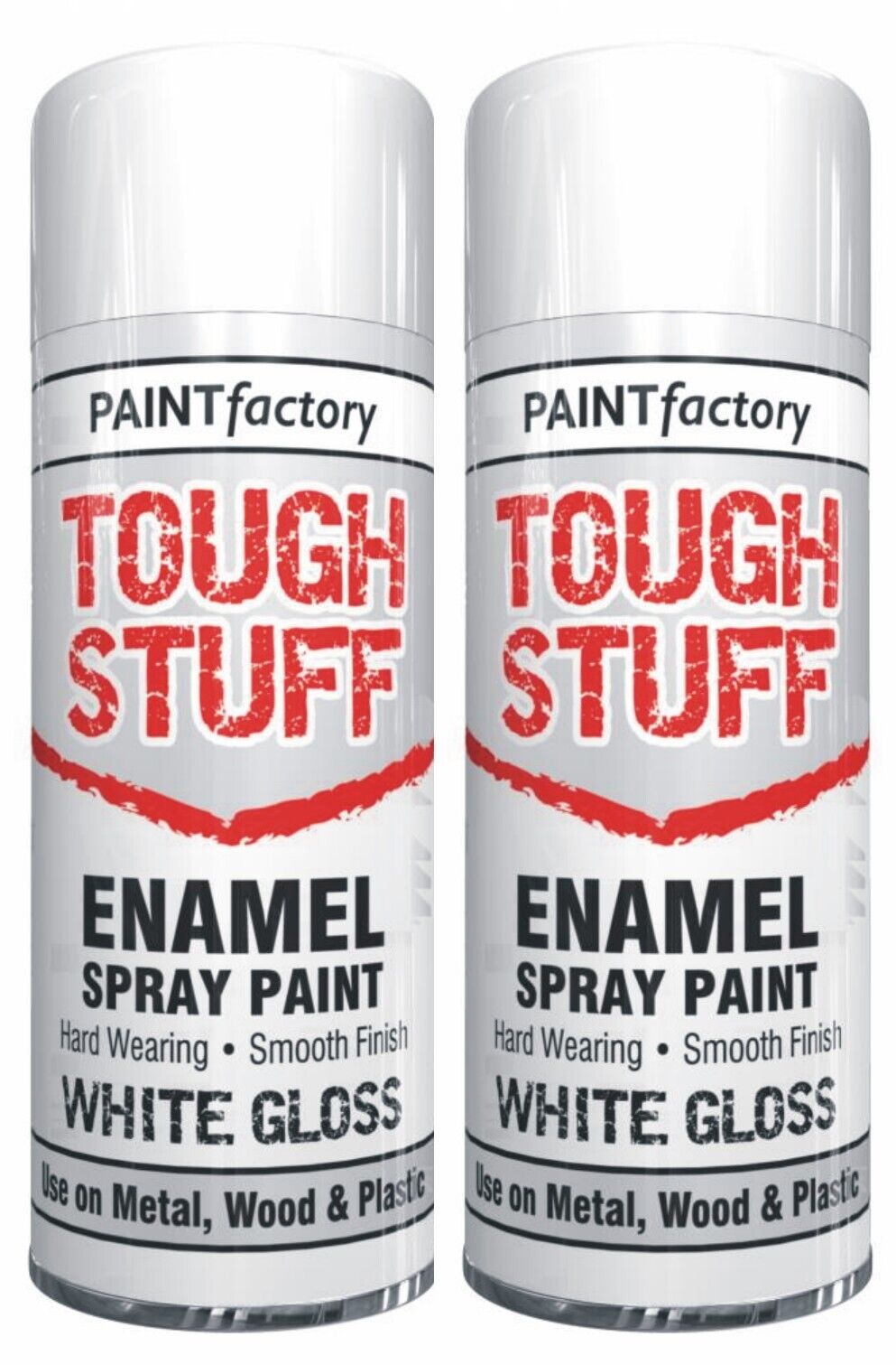 2x400ML ENAMEL WHITE GLOSS SPRAY PAINT WOOD METAL PLASTIC ART CRAFT TOUGH STUFF