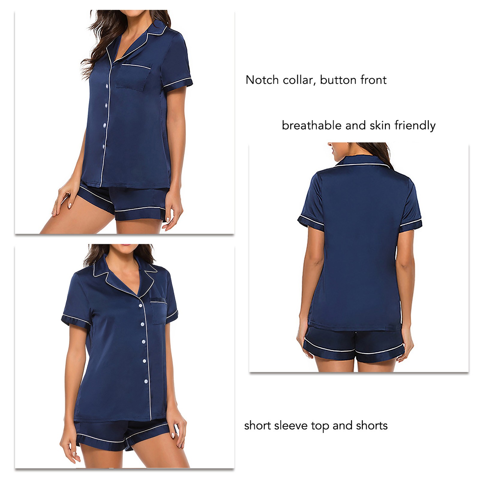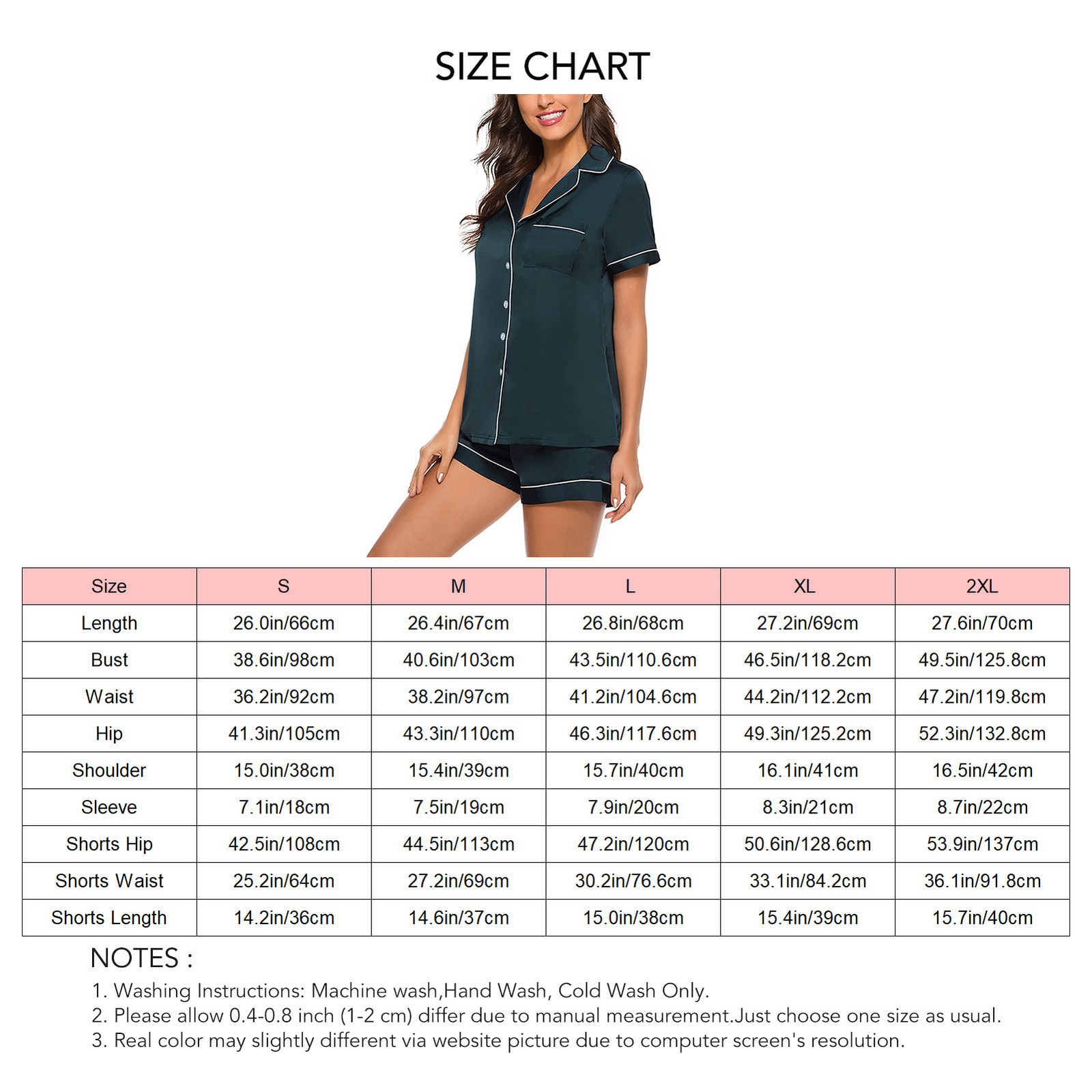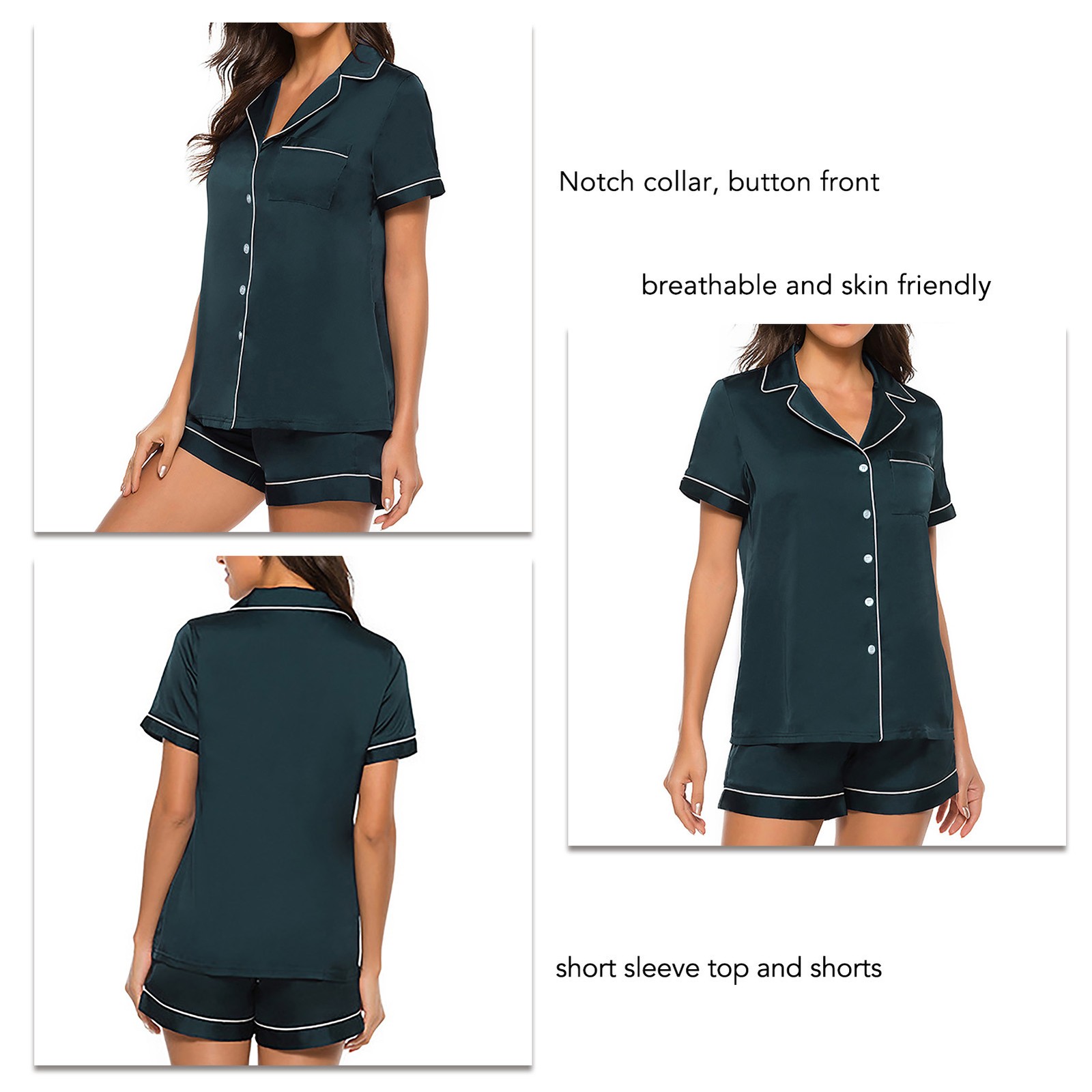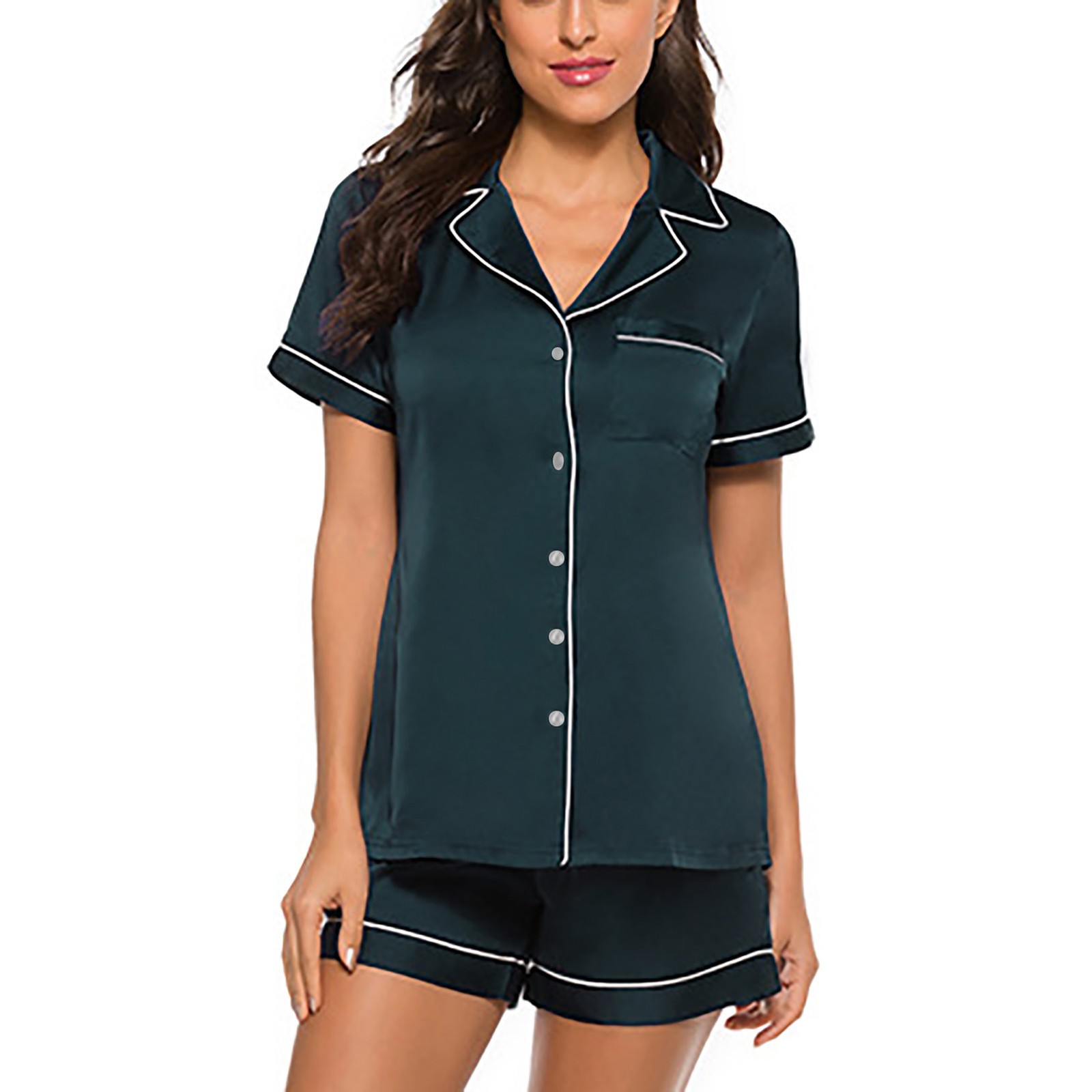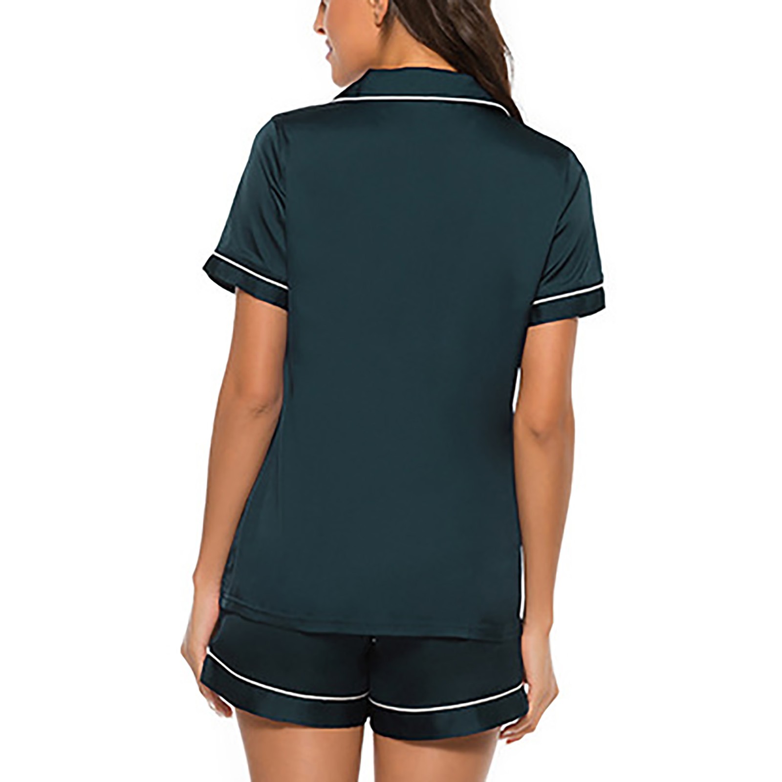 Two Piece Silky Pajamas Set Short Sleeve Top With Shorts Notch Collar Button UK