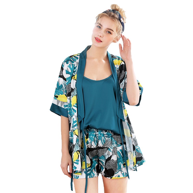Women Satin Pajamas Faux Silk Silky Pajama Set Elegant Robe 3pcs Suspender4973