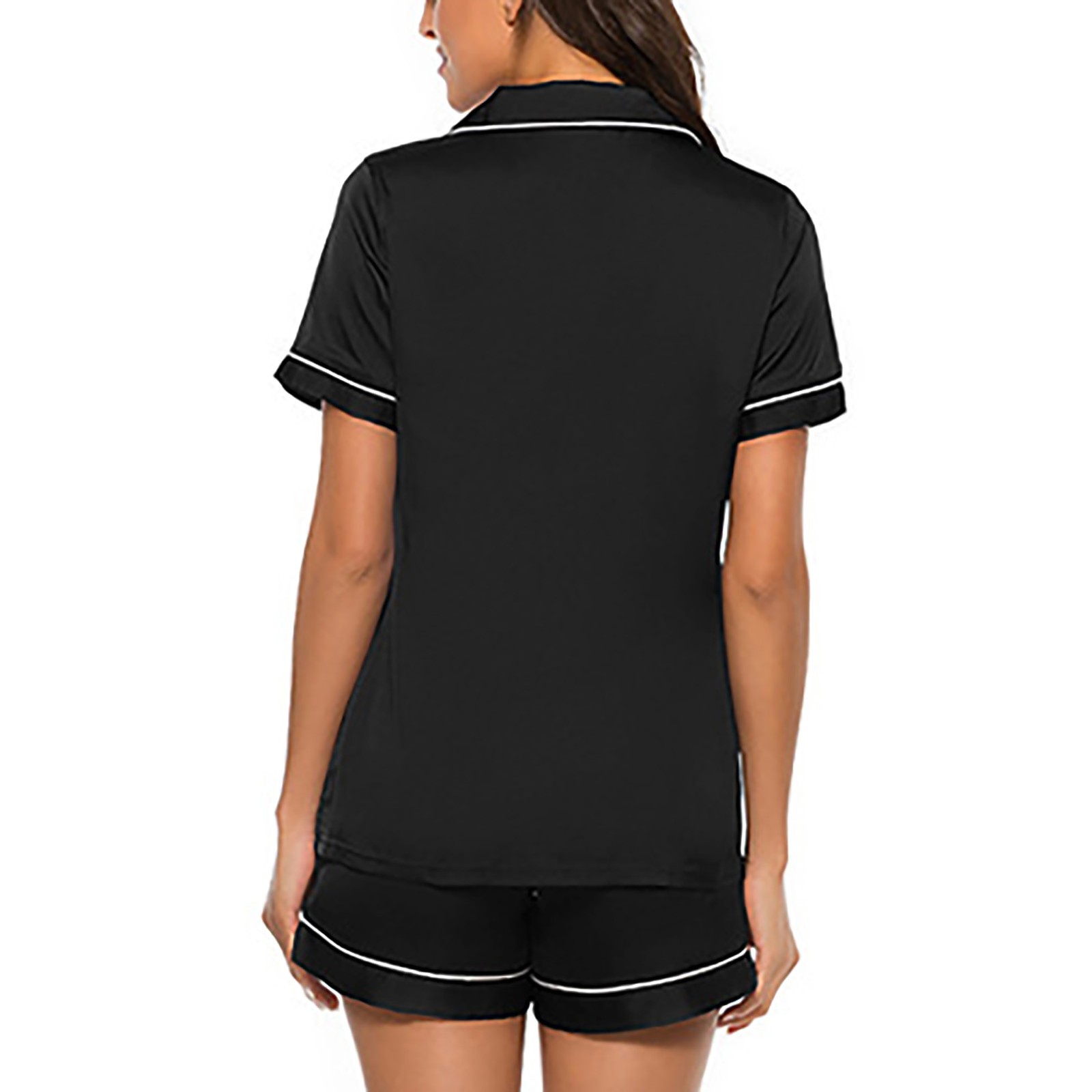 Two Piece Silky Pajamas Set Short Sleeve Top With Shorts Notch Collar Button