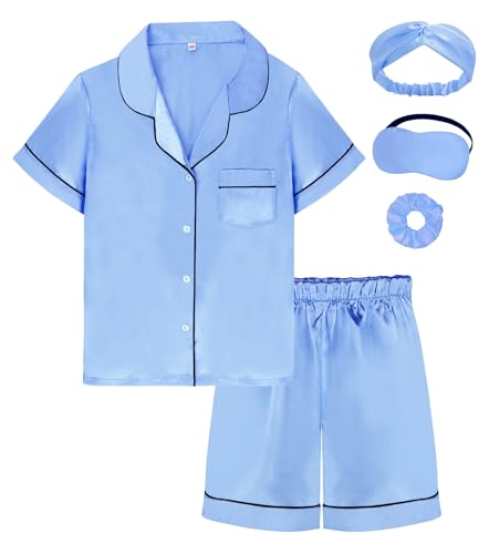 EPLAZA Kids Satin Pajamas Sets Girls Boys Button-Down Silky Pajamas Sleepwear with Hairband Eye Mask Hair Tie (Grayish blue-short, 160)