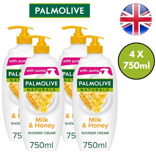4 x 750ml Palmolive Naturals Shower Gel, Milk & Honey Shower Cream Nourishing