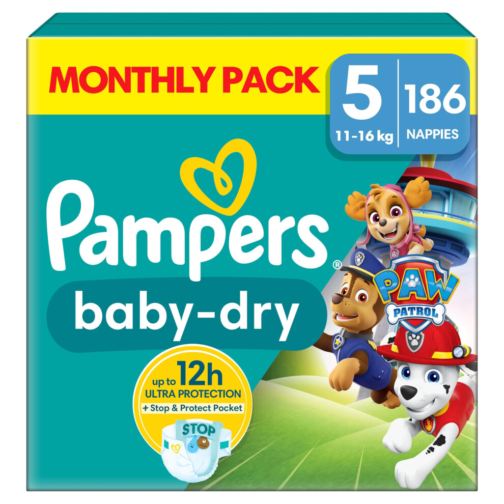 Pampers Baby-Dry Paw Patrol Edition Size 5, 186 Nappies, 11kg - 16kg, Monthly Pack, with A Stop & Protect Pocket to Help Prevent Leaks at The Back