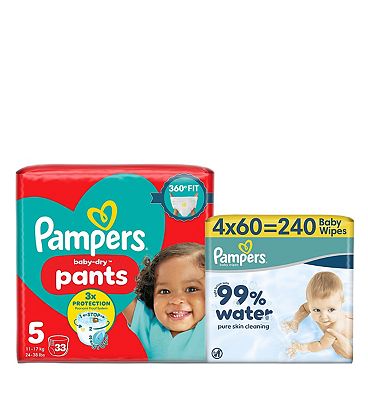 Pampers Baby-Dry Nappy Pants Size 5, 33 Nappies & Pampers 99 Percent Water Baby Wipes Plastic Free 60 Wipes Bundle