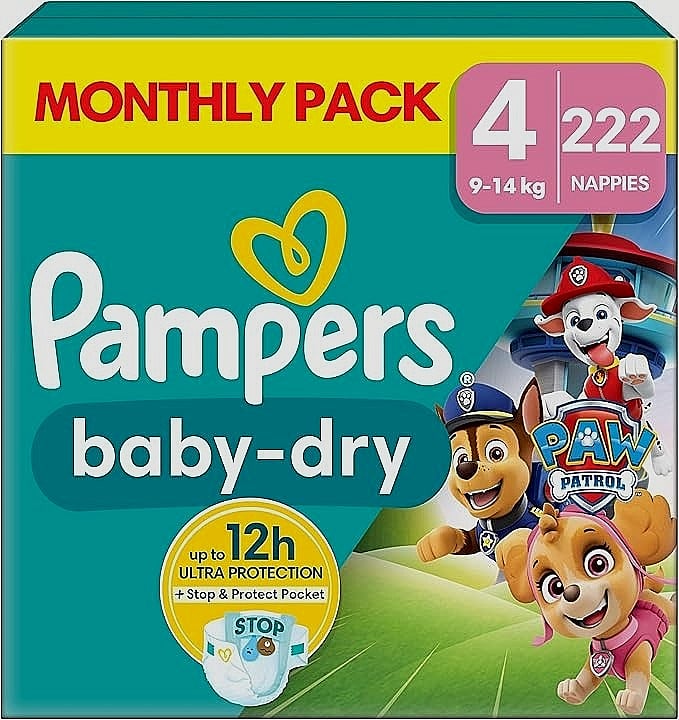Pampers Baby-Dry Paw Patrol Edition Size 4, 222 Nappies, 9kg-14kg, Monthly Pack+