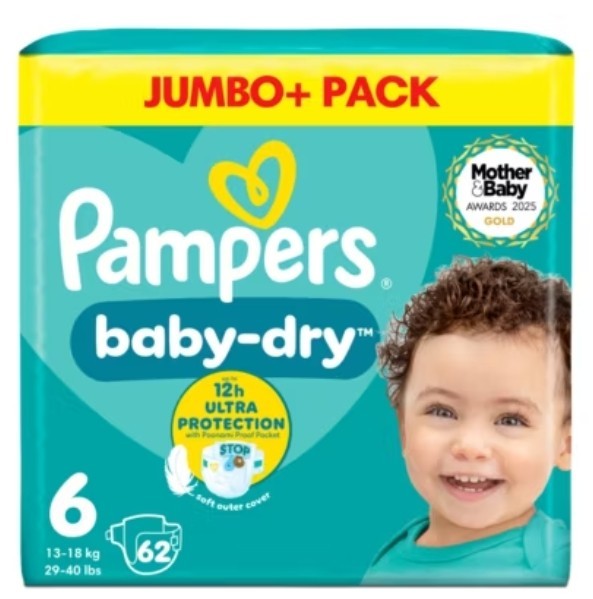 Pampers Baby-Dry Size 6, 62 Nappies, 13kg-18kg, Jumbo+ Pack