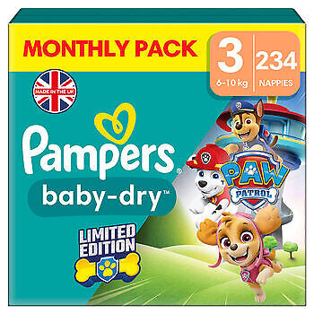 Pampers Baby-Dry Paw Patrol Edition Size 3, 234 Nappies, 6kg-10kg, Monthly Pack, Up to a 100% Leak-Free & Comfortable Night