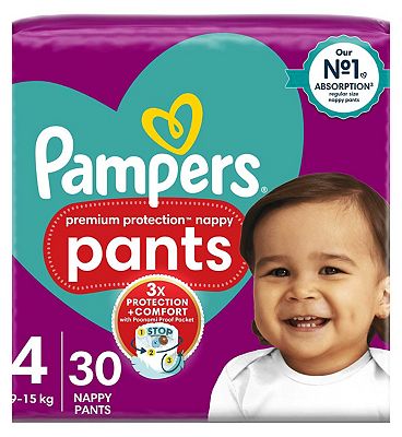 Pampers Premium Protection Nappy Pants Size 4, 30 Nappies, 9kg - 15kg, Essential Pack
