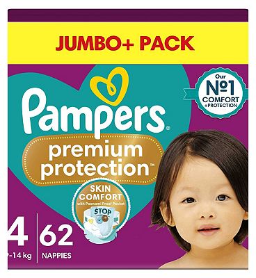 Pampers Premium Protection Size 4, 62 Nappies, 9kg - 14kg, Jumbo+ Pack