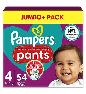Pampers Premium Protection Nappy Pants Size 4, 54 Nappies, 9kg - 15kg, Jumbo+ Pack