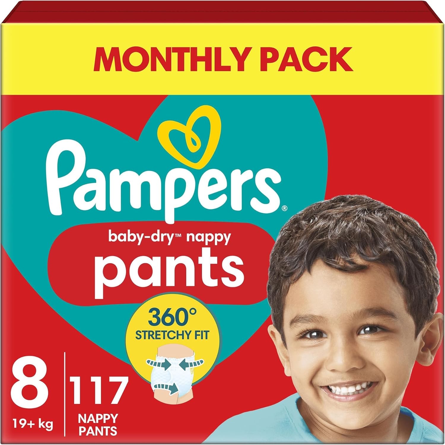 Pampers Baby-Dry Nappy Pants Size 8, 117 Nappies, 17kg+, Monthly Pack, 360° Fit To Help Prevent Gaps And Leaks