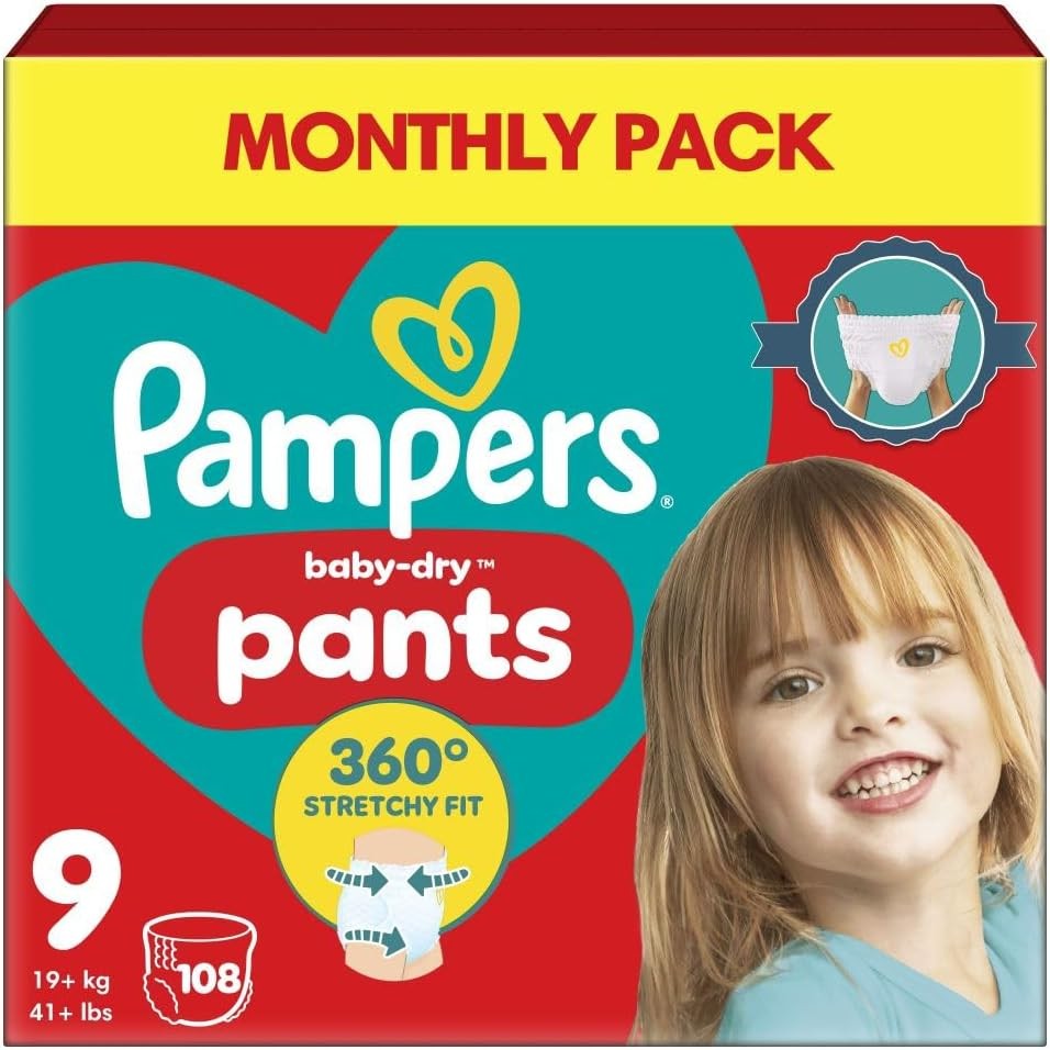 Pampers Baby-Dry Nappy Pants Size 9, 108 Nappies, 19kg+, Monthly Pack, 360° Fit to Help Prevent Gaps and Leaks