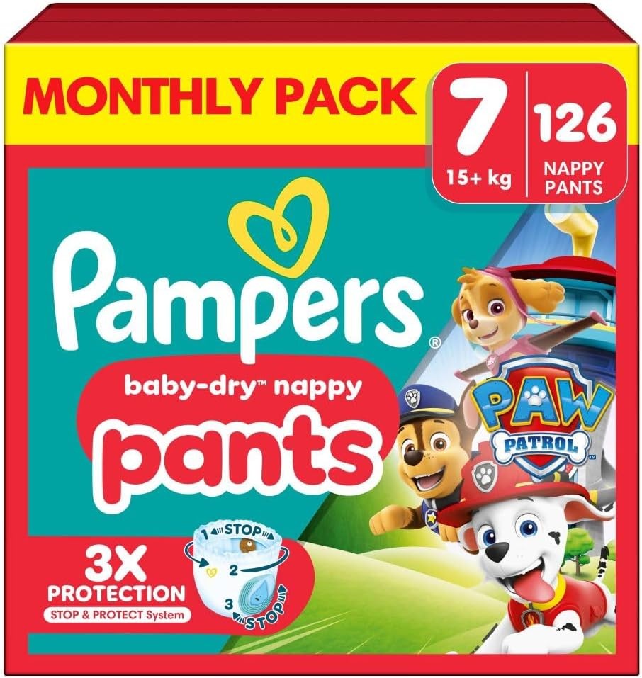 Pampers Baby-Dry Nappy Pants Paw Patrol Edition Size 7, 126 Nappies, 15kg+, Mon