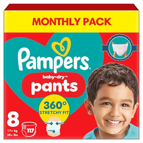Pampers Baby-Dry Nappy Pants Size 8, 117 Nappies, 17kg+, Monthly Pack, 360° Fit To Help Prevent Gaps And Leaks