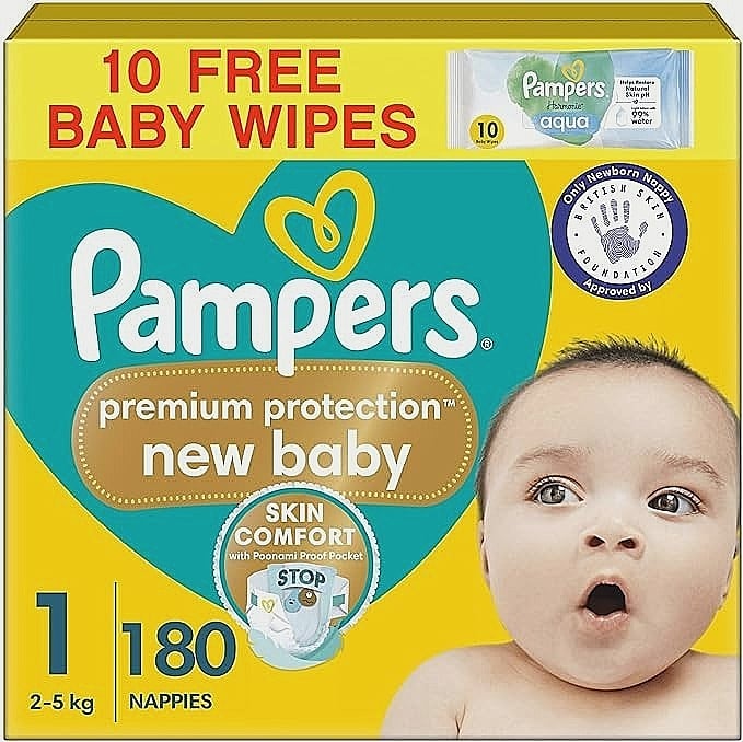 Pampers Premium Protection New Baby Size 1, 180 Nappies, 2kg-5kg, Monthly Pack, The Only Newborn Nappy Approved by British Skin Foundation