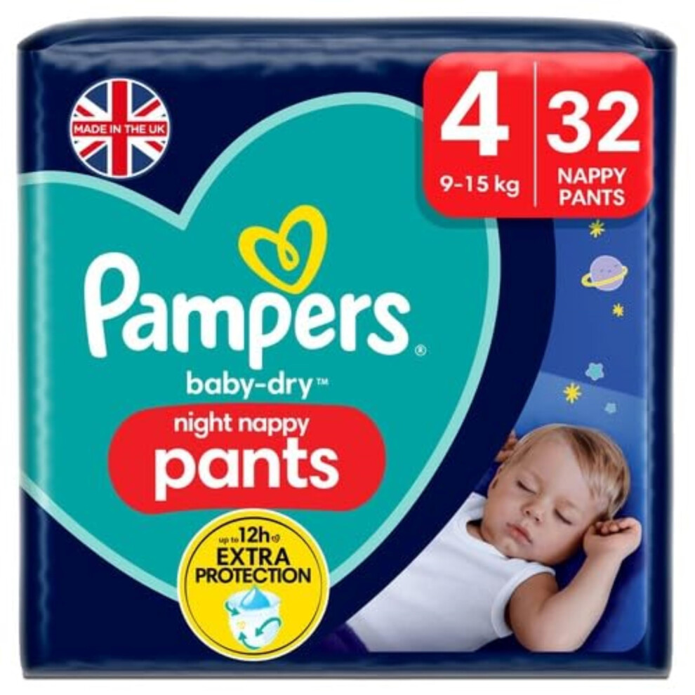 Pampers Baby-Dry Night Nappy Pants Size 4, 32 Night Nappies, 9kg-15kg, Essential Pack, Pampers Most Absorbent Pants for Extra Night Protection