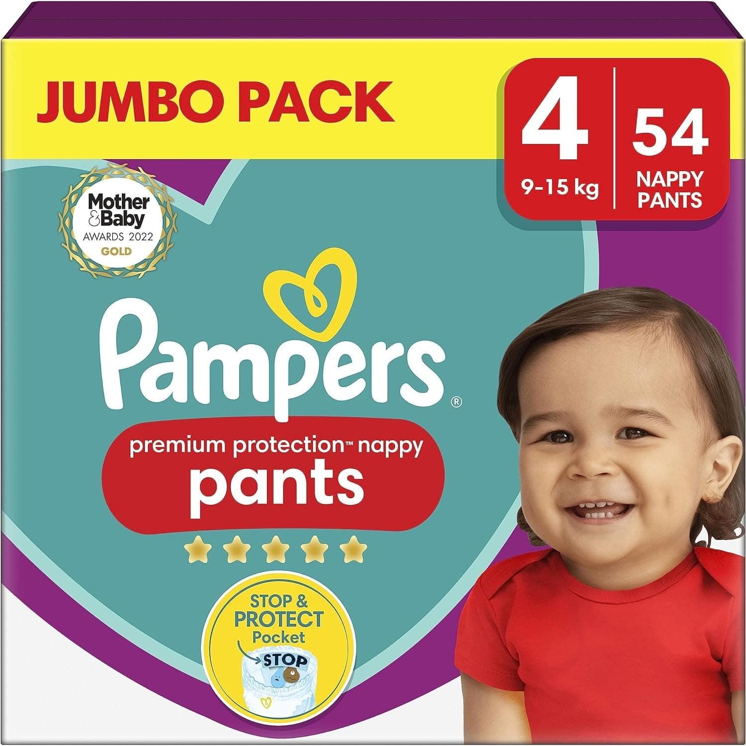 Pampers Premium Protection Nappy Pants Size 4, 54 Nappies, 9kg - 15kg, Jumbo+ Pack
